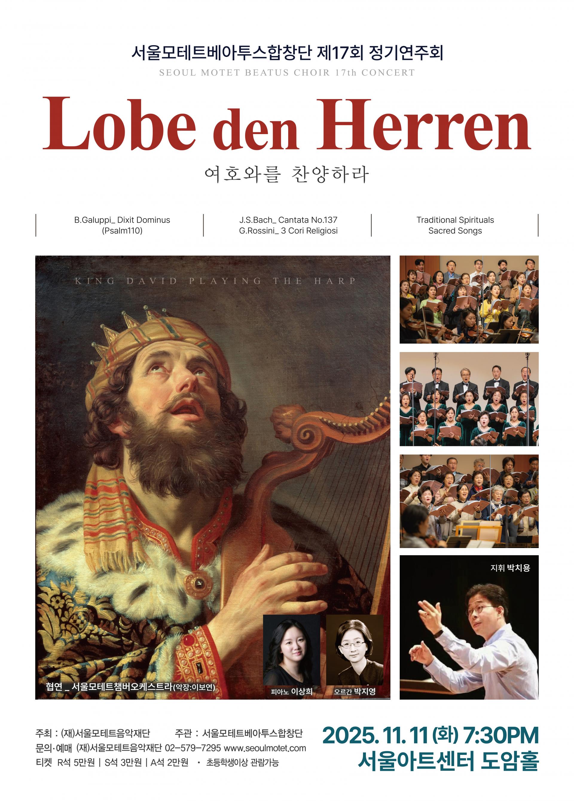 합창음악과 교회음악을 순수 아마추어 정신으로 그 아름다움과 고귀한 가치를 지켜온 서울모테트베아투스합창단이 2025년 11월 11일(화) 오후 7시 30분 서울아트센터 도암홀에서 「Lobe den Herren – 여호와를 찬양하라」는 주제를 가지고 제17회 정기연주회를 갖는다.